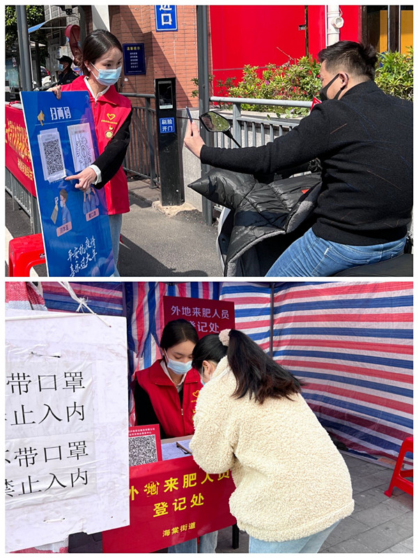 “請您出示一下行程碼、健康碼”“請您登記一下個人信息”,4月3日上午,在廬陽區(qū)海棠街道荷塘社區(qū)金荷苑小區(qū)主入口處,一名忙碌在人群中的“紅馬甲”格外顯眼,她就是來自安徽建科青年黨員志愿者——趙童心,她正在積極協(xié)助社區(qū)人員開展疫情排查防控工作。