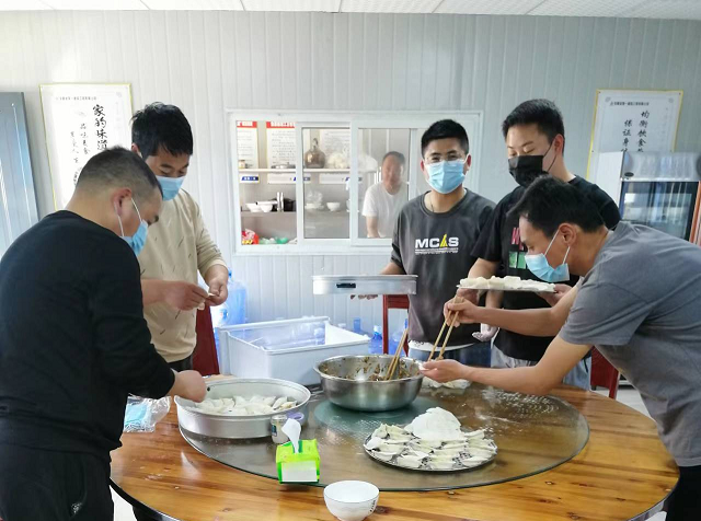 職工食堂內(nèi),大家團(tuán)結(jié)協(xié)作、分工明確,揉面、搟皮兒、包餃子、煮餃子,有條不紊,有的餃子像“金元寶”,有的像“月牙”,一顆顆餃子里,既包裹著收獲、感恩,也包裹著對美好未來的期許。大家一邊開心交談,一邊展示自己的手藝,其樂融融的氛圍沖淡了不能回家的失落感。