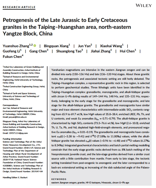 近日,安徽建科綠色建筑節(jié)能與綠色建材研究組在機(jī)制砂母巖原材料研究領(lǐng)域取得新進(jìn)展,相關(guān)研究成果發(fā)表在國際期刊《Geological Journal》(GJ Q3, IF=2.489)上,論文題為“Petrogenesis of the Late Jurassic to Early Cretaceous granites in the Taiping-Huangshan area, north-eastern Yangtze Block, China”,張元朔博士為論文第一作者,黨委書記、董事長項(xiàng)炳泉,教授閆峻為論文通訊作者,該項(xiàng)工作得到了國家自然科學(xué)基金項(xiàng)目、安徽建工集團(tuán)、安徽省建筑科學(xué)研究設(shè)計院等單位科學(xué)計劃項(xiàng)目經(jīng)費(fèi)資助。