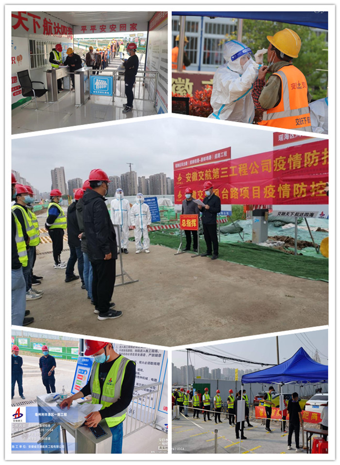 “請(qǐng)大家戴好口罩有序排隊(duì),前后人員保持一米距離?!薄澳茫鍪灸陌部荡a和行程卡,并接受體溫檢測?!比涨埃量h邵渡口大橋項(xiàng)目部聯(lián)合邵渡口村委會(huì),集中組織28名管理人員及120名勞務(wù)班組作業(yè)人員依次進(jìn)行核酸檢測、體溫測量和信息登記。二公司、三公司、亳州利辛港區(qū)項(xiàng)目部、滁州項(xiàng)目部等基層單位及時(shí)召開專題會(huì)議,按照公司黨委要求,積極落實(shí)疫情防控措施、制定抗疫方案,對(duì)工作人員進(jìn)行常態(tài)化體溫檢測、定期核酸檢測、兩碼聯(lián)查登記、人員進(jìn)出管控,并積極加強(qiáng)防疫宣傳、定期消殺及物資儲(chǔ)備……多措并舉阻斷疫情擴(kuò)散,確保疫情防控措施落實(shí)到位,強(qiáng)化疫情源頭防控。