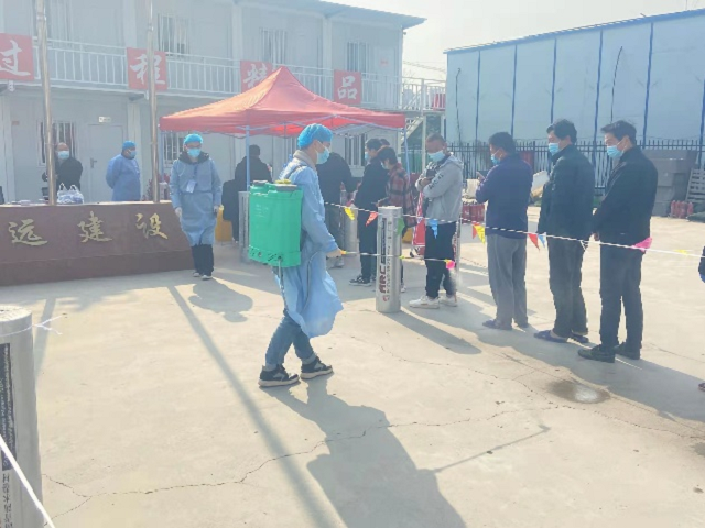 宿遷市進(jìn)入4月份以來疫情較為嚴(yán)重,自4月1日起,全市分區(qū)域進(jìn)行封控、管控,上級政府部門要求施工單位積極配合協(xié)助開展防疫工作。疫情就是命令,接到任務(wù)后,項(xiàng)目經(jīng)理劉闖立即召開防疫工作會議,全面落實(shí)各項(xiàng)疫情防控措施。設(shè)置單獨(dú)的隔離觀察室,用于需臨時隔離觀察的人員單獨(dú)生活居??;準(zhǔn)備口罩、測溫計(jì)、消毒液等防疫物資;排查兩周內(nèi)往來史、接觸史,杜絕疫情的輸入性、擴(kuò)散性蔓延;對所有進(jìn)出施工區(qū)、辦公區(qū)、生活區(qū)人員進(jìn)行實(shí)名制登記和現(xiàn)場消毒殺菌;嚴(yán)格落實(shí)施工工地封閉管理,全面管控人員出入工地,無關(guān)人員不得進(jìn)入工地,項(xiàng)目部人員停止休假、探親和聚集活動。除此之外,3月26日起,政府在項(xiàng)目部設(shè)置了核酸檢測站點(diǎn),目前已連續(xù)進(jìn)行了19次核酸檢測,包括附近工地和居民,每天約一千人,工作量極大。項(xiàng)目部志愿者積極配合現(xiàn)場防疫工作,對每個進(jìn)入現(xiàn)場的人員進(jìn)行掃碼、登記、測量體溫,為打贏疫情防控阻擊戰(zhàn)貢獻(xiàn)國企力量。