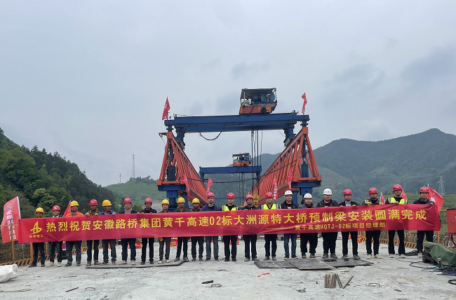 4月18日上午,隨著大洲源特大橋最后一片預(yù)制梁精確就位,安徽路橋集團(tuán)黃千高速02標(biāo)武陽互通大洲源特大橋箱梁安裝圓滿完成。