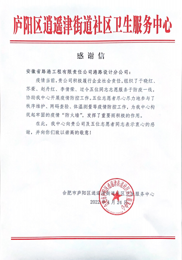 4月24日,勘測設(shè)計研究院收到合肥市廬陽區(qū)逍遙津街道社區(qū)衛(wèi)生服務中心的感謝信,信中對于曉紅、蘇豪、趙丹紅、李倩榮、過令五位同志積極投身于社區(qū)疫情防控工作給予了高度肯定和衷心感謝。 感謝信中指出,疫情當前,勘設(shè)院志愿者們積極響應公司號召,踴躍投入防疫一線,始終與社區(qū)工作人員一起在秩序維護、體溫測量、兩碼查驗的主戰(zhàn)場上并肩作戰(zhàn),構(gòu)筑起基層疫情防控的嚴密防線,以實際行動踐行了“奉獻、友愛、互助、進步”的志愿者精神,共同為打贏疫情防控阻擊戰(zhàn)作出了積極貢獻。