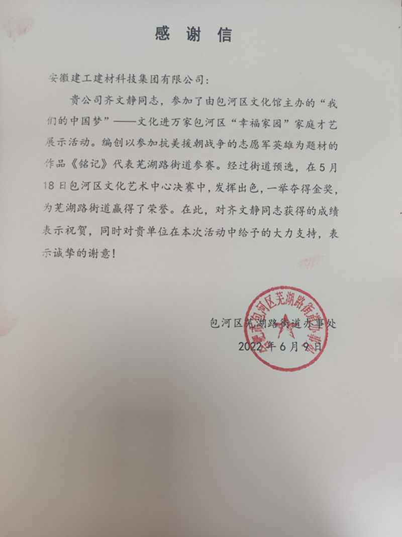 近日,公司收到蕪湖路街道發(fā)來的感謝信,感謝我公司對區(qū)文化建設(shè)活動的大力支持以及公司員工齊文靜在包河區(qū)“幸福家園”家庭才藝展示活動中的優(yōu)異表現(xiàn)。