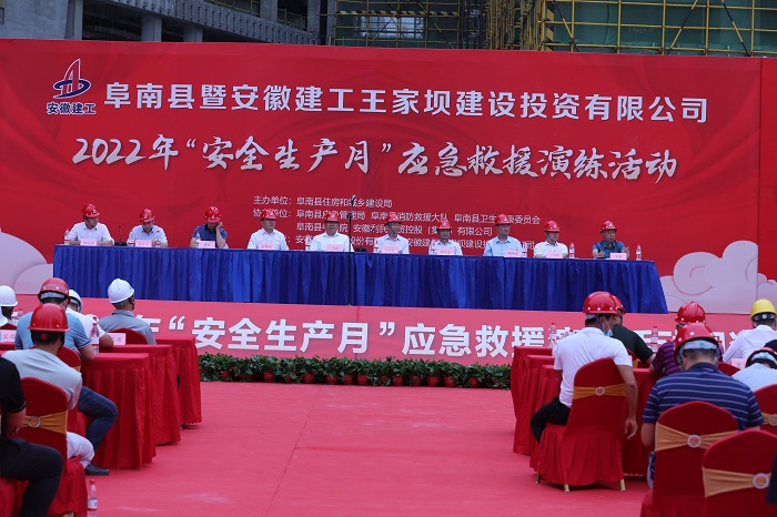 當(dāng)天上午,阜南縣暨安徽建工王家壩建設(shè)投資有限公司2022年“安全生產(chǎn)月”應(yīng)急救援演練活動在阜南縣中醫(yī)院新區(qū)二期項目成功舉辦,阜南縣副縣長王磊,安建總承包副總經(jīng)理王慶松出席并致辭。阜南縣住建局、應(yīng)急管理局、衛(wèi)健委、消防大隊、中醫(yī)院以及安徽利民集團(tuán)等相關(guān)單位負(fù)責(zé)人參加。