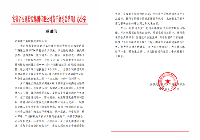 感謝信,是業(yè)主對(duì)項(xiàng)目部各項(xiàng)工作以及項(xiàng)目全體參建人員辛勤勞動(dòng)的極大肯定和鼓勵(lì),更是激勵(lì)和鞭策。安徽路橋集團(tuán)黃千高速項(xiàng)目部將繼續(xù)秉承國(guó)企責(zé)任擔(dān)當(dāng),發(fā)揚(yáng)敢于精益求精、勇于創(chuàng)新的工匠精神,圍繞“平安百年品質(zhì)工程”目標(biāo),積極投身項(xiàng)目收官階段工作,努力為當(dāng)?shù)匕傩战ㄔ煲粭l“振興致富路”,為當(dāng)?shù)厣剿粝乱粭l“綠色生態(tài)路”,以實(shí)際行動(dòng)向黨的二十大勝利召開(kāi)獻(xiàn)禮。