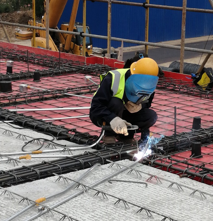 圖為蚌埠分公司公安局三個(gè)基地項(xiàng)目焊工在烈日下進(jìn)行電管焊接作業(yè)