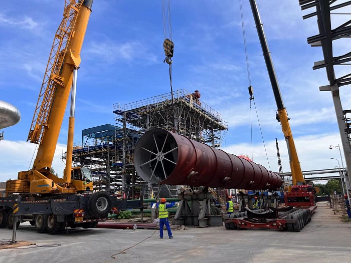 圖為安慶石化污水汽提現(xiàn)場(chǎng)進(jìn)行分段吊裝汽提塔