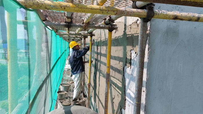 圖為房建(裝飾)分公司壹石通項(xiàng)目綜合樓外粉班組正在進(jìn)行抹灰施工