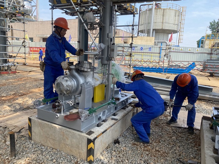 圖為安慶石化污水汽提裝置現(xiàn)場(chǎng)酸性水進(jìn)料泵找平找正
