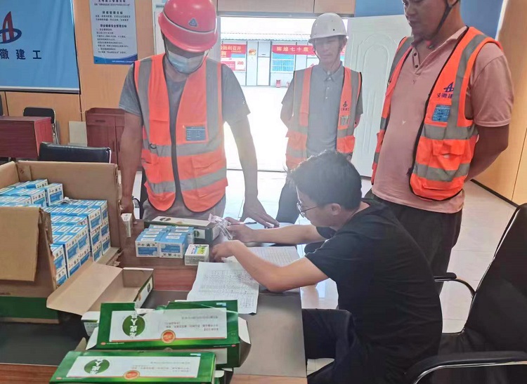 6月16日,門窗公司開展為所在項(xiàng)目門窗安裝班組“夏送清涼”活動(dòng)。 在現(xiàn)場(chǎng),門窗公司一行人員不僅給班組人員進(jìn)行針對(duì)高溫天氣的安全交底、發(fā)放安全知識(shí)手冊(cè),還為班組人員配發(fā)了統(tǒng)一購(gòu)買的防暑降溫藥品,并積極倡議所有施工作業(yè)的人員都隨身攜帶人丹和風(fēng)油精,以備身體不適時(shí)及時(shí)服用。