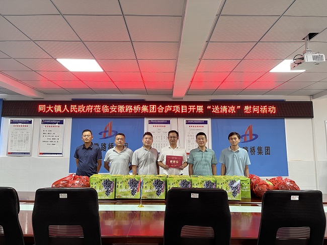 在送達(dá)感謝信的同時(shí),同大鎮(zhèn)人民政府工作人員還攜帶西瓜、葡萄等時(shí)令水果,開展防暑降溫“送清涼”慰問(wèn)活動(dòng),為奮戰(zhàn)在施工一線的路橋集團(tuán)建設(shè)者加油鼓勁。