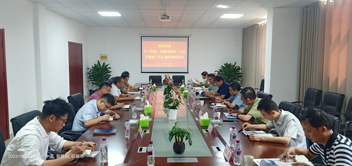 8月5日上午,銅陵市工商聯(lián)主席朱前定和住建局總工程師邢應(yīng)葆到長(zhǎng)江建投調(diào)研座談。銅陵市工商聯(lián)副主席江勝利,安建總承包副總經(jīng)理、長(zhǎng)江建投總經(jīng)理陳道兵參加。