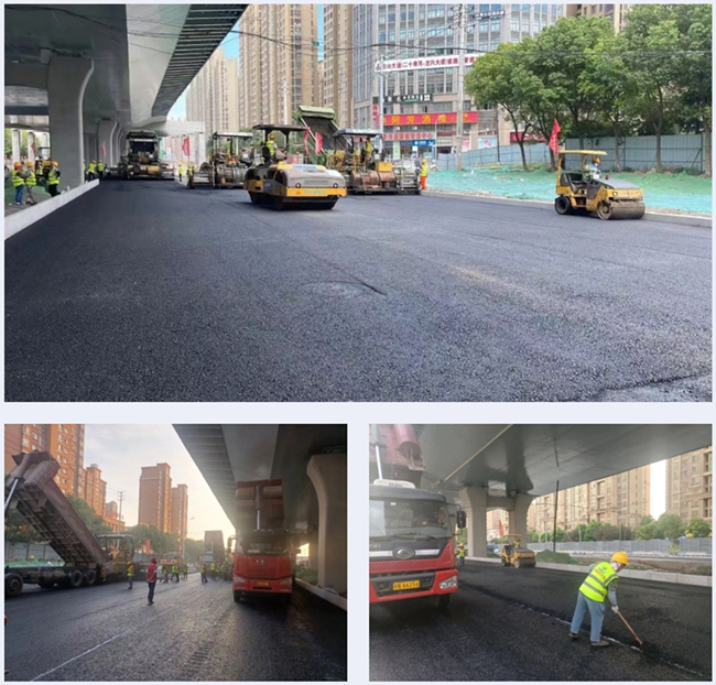 施工人員頂著瀝青路面蒸騰滾燙的熱氣,各司其職,相互配合,嚴(yán)格控制瀝青溫度、松鋪厚度、碾壓遍數(shù)、寬度、坡度等施工參數(shù)。各項(xiàng)工序緊密銜接,忙而不亂,嚴(yán)格按規(guī)范要求進(jìn)行施工。經(jīng)現(xiàn)場檢測和試驗(yàn)室取樣檢測,試驗(yàn)路段的平整度、厚度、壓實(shí)度等各項(xiàng)指標(biāo)均符合規(guī)范和設(shè)計(jì)要求,達(dá)到了試驗(yàn)段的預(yù)期目的,標(biāo)志著包公大道03標(biāo)項(xiàng)目施工進(jìn)入了全新階段。