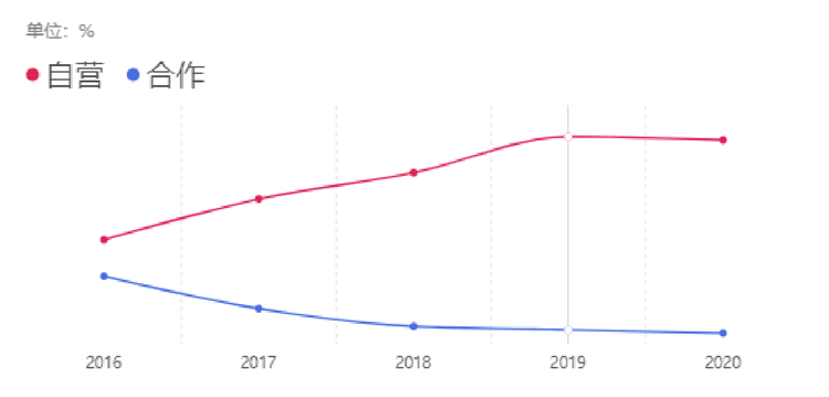 公司自 2015年采取“堅(jiān)持自營(yíng)、減少聯(lián)營(yíng)”政策以來(lái),自營(yíng)率逐年提高,2015年自營(yíng)率約60%,2020年自營(yíng)率已達(dá)到94%以上。