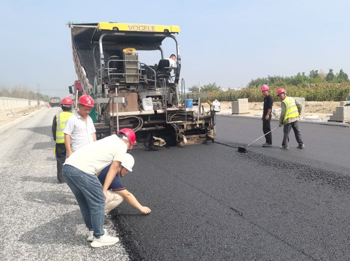 十四、蚌埠公司:固鎮(zhèn)縣生態(tài)路網(wǎng)PPP項(xiàng)目唐南路延伸段在國慶期間進(jìn)行瀝青攤鋪