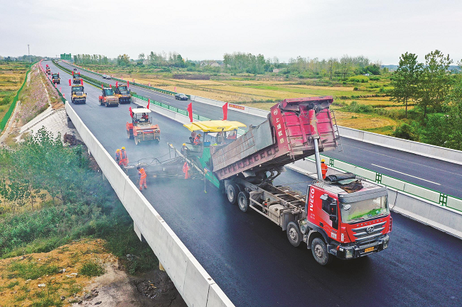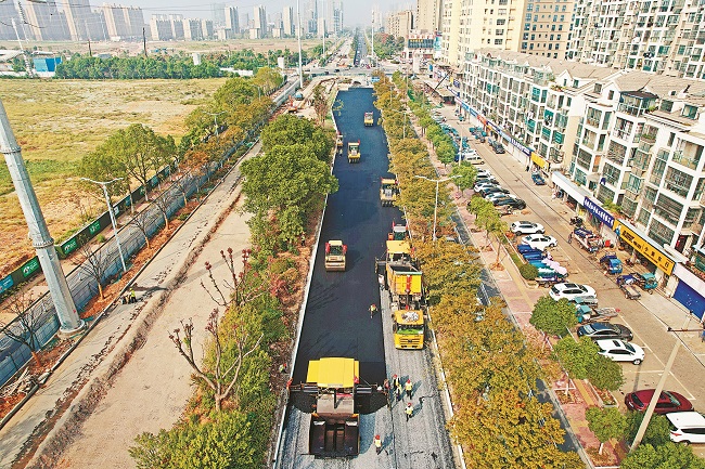 9月28日,滁天高速來(lái)安縣半塔鎮(zhèn)境內(nèi),安徽路橋集團(tuán)筑路工人們正在抓緊時(shí)間鋪設(shè)瀝青。滁天高速公路項(xiàng)目起自來(lái)安縣水口鎮(zhèn)甲埂村,終于天長(zhǎng)市開(kāi)發(fā)區(qū)南側(cè)陸營(yíng)村,全長(zhǎng)約 67.085公里,是安徽省“四縱八橫”高速公路網(wǎng)中“橫六”的重要組成部分。項(xiàng)目建成后,滁 州至天長(zhǎng)兩地間的行車(chē)距離將大大減少,進(jìn)一步打通了北沿江高速通道,對(duì)促進(jìn)長(zhǎng)江經(jīng)濟(jì) 帶一體化發(fā)展具有重要意義。據(jù)了解,該路段預(yù)計(jì)今年11月底建成通車(chē)。