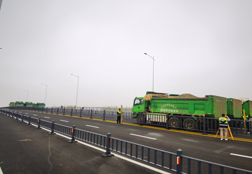 在前期精心制定試驗方案的基礎上,二站現(xiàn)場投入20余名技術人員,劃分為設備組、聯(lián)絡組、測量組等6個小組,各司其職,有序高效。在現(xiàn)場技術人員的指揮下,荷載試驗按方案依次開展。靜載試驗時采用9輛三軸載重汽車按不同工況、不同位置分級對各控制截面進行等效加載,變化著花樣“考驗”大橋,檢驗結構的強度、剛度和抗裂性等工作性能,通過環(huán)境隨機激振法、行車激振法和跳車激振法測試橋跨結構的動力特性?,F(xiàn)場配備精度高、抗干擾能力強的無線動、靜態(tài)采集分析系統(tǒng)及高精密電子水準儀對應力(應變)、位移、自振頻率等參數(shù)進行實時采集分析。在整個試驗過程中,大橋各測試參數(shù)正常,整體表現(xiàn)優(yōu)良,順利通過各項“考驗”。
