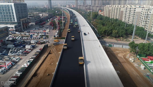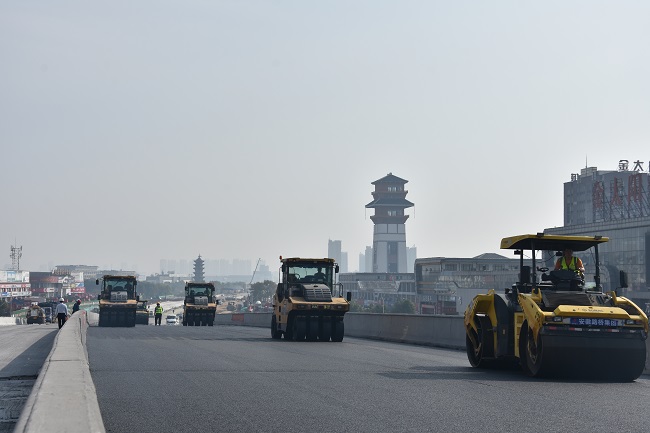 迎賓大道高架橋,作為本項(xiàng)目的控制性工程,為項(xiàng)目最長(zhǎng)的一座高架橋,全橋共39跨,其中預(yù)制箱梁35跨315片、鋼箱梁4跨48段,該橋全長(zhǎng)1272.5米。本次左幅瀝青攤鋪為中面層6厘米厚AC-20C,共計(jì)16000㎡。下一步,項(xiàng)目部將進(jìn)行上面層4厘米厚AC-13C瀝青攤鋪、右幅瀝青攤鋪以及伸縮縫安裝、標(biāo)線施工、路燈安裝等后續(xù)工作。