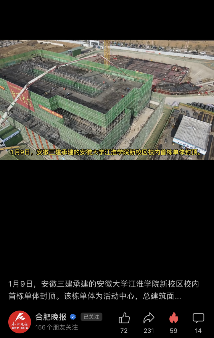 1月9日、10日,合肥晚報視頻號、江淮晨報先后報道安徽三建承建的安徽大學江淮學院新校區(qū)項目建設取得的最新進展。