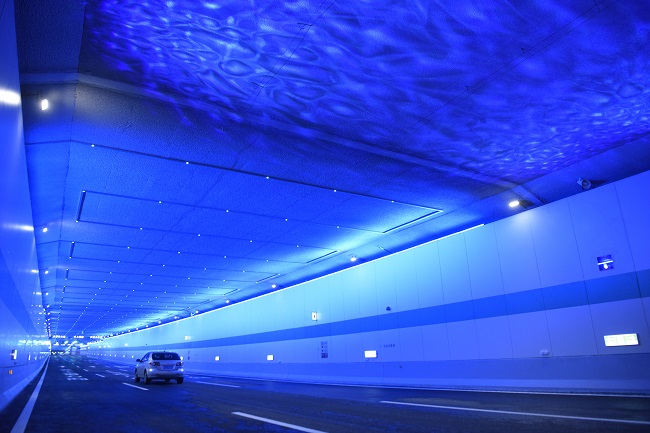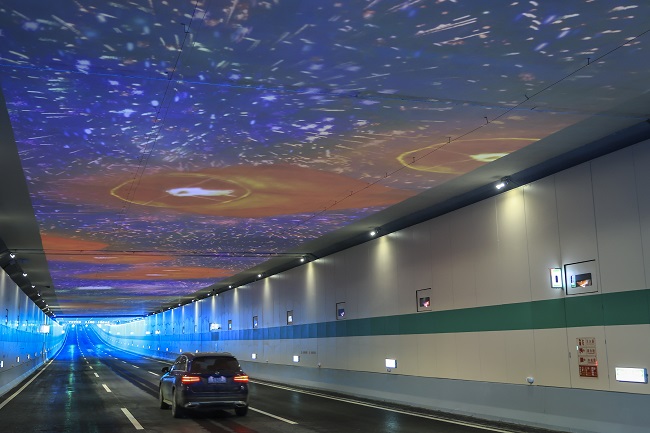 由安徽路橋集團承建的花園大道(徽州大道-包河大道)工程,于2020年12月正式開建。為最大限度減少對駱崗生態(tài)公園景觀的影響,花園大道項目主要采取下穿方式,在設計復雜程度、工藝難度系數上均刷新全省“紀錄”,創(chuàng)下全省市政道路建設史上的“多個首個”。其中花園大道與廬州大道在地下交互,是安徽省首個也是最深的地下互通立交工程,最深處距離地面達26米,花園大道位于地下二層,通過地下互通匝道同廬州大道實現交互。隧道設計了三種不同的燈光模式,距東、西側隧道出入口分別約30m、100m處,采用投影燈模式,呈現一片流動的“藍天白云”和“藍色水流”。隧道頂部約有2000米采用節(jié)能LED燈,呈現七色繁星變幻模式,點點燈光像夜空的星星明亮閃爍。此外,隧道中央約有100多米的距離,采用了投影機模式,可根據需要變換不同的內容循環(huán)播放。為響應節(jié)能減排要求,投影模式不會24小時全天候開啟,而將間斷投放。