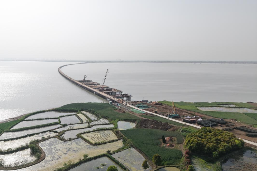 4月2日和8日,城東湖、城西湖兩座鋼便橋相繼合龍,為后續(xù)項(xiàng)目建設(shè)打通了“任督二脈”,標(biāo)志著項(xiàng)目物資運(yùn)輸和機(jī)械調(diào)度的“生命線”全線貫通,特大橋?qū)⒄竭M(jìn)入施工建設(shè)階段。